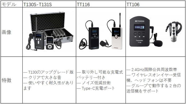 送信機と複数の受信機で構成される無線通信システムです。ガイドはマイク付きの発信機を装着し、発信機に向かって話すと、その音声が観光客が身に着けている受信機に伝わります。これにより、騒がしい環境や混雑した環境でも、グループの全員がガイドの声をはっきりと聞くことができます。