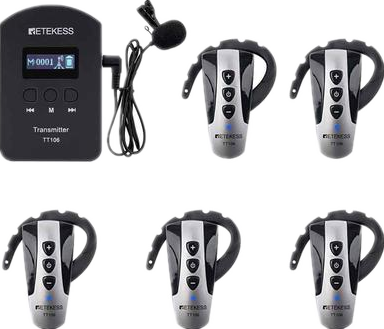 ワイヤレスガイドシステムとは、一人の話し手が複数の聞き手に言葉を送る事ができる無線通信システムです。話し手がワイヤレスマイク(携帯型送信機)を持ち、聞き手側はワイヤレスレシーバー(携帯型受信機)を持つ、無線による単方向のガイドシステムです。受信機は何台でも使用できるので、同時に多くの人へ説明する事が出来ます、双方ともに移動しながらでも声を聞けます。