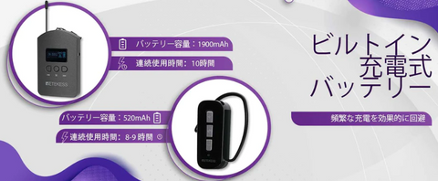 送信機、受信機ともに3000mAhの充電式バッテリーを内蔵。 フル充電にはわずか4時間かかります。 フル充電後、送信機は最大18時間、受信機は約60〜70時間動作可能で、頻繁に充電する必要がなく、一日中途切れることなく使用できます。