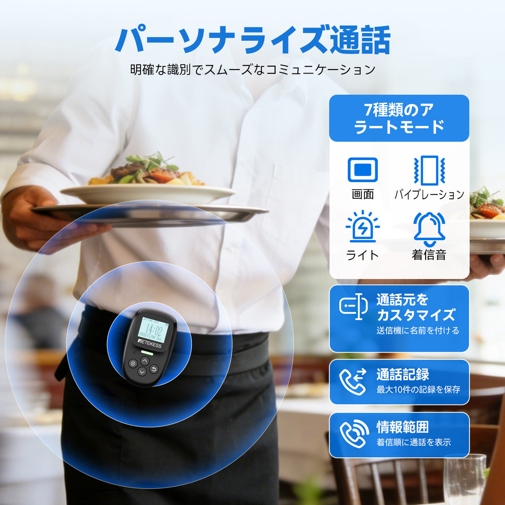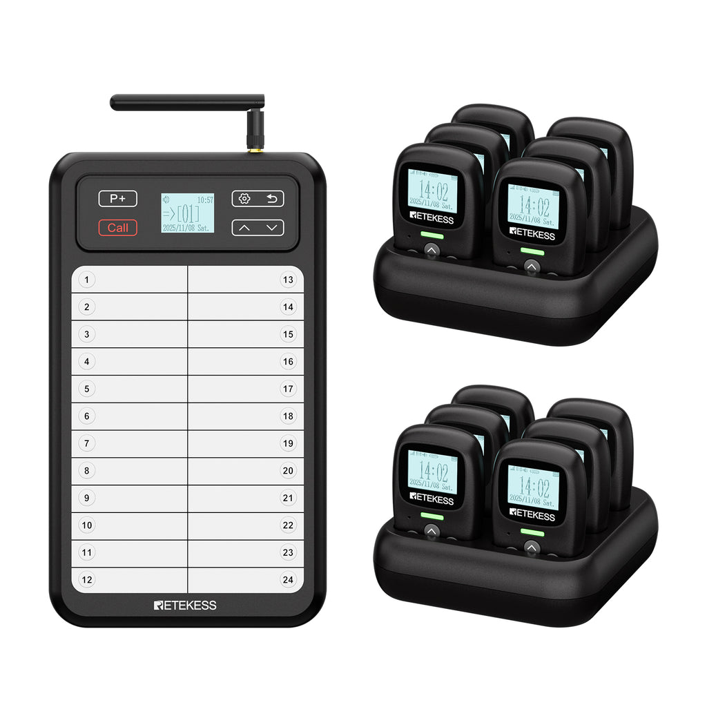 RETEKESS TD037 呼び出し システムは、最大99台の受信機をサポートし、設定も操作も簡単です。見やすいバックライト画面、5万回の押下に耐える高耐久ボタンを備え、パソコン接続での細かいカスタマイズも容易に行えます。多様な呼び出しモード、個別ラベル設定、800メートル以上の長距離通信により、確実な連絡と拡張性を求める店舗や施設、大規模チームの運用に最適なソリューションです。