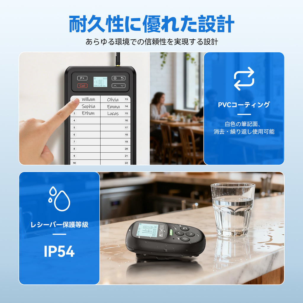 耐久性を考慮した設計で、過酷な業務使用にも耐えます。送信機のボタンは5万回の押下テスト済み。受信機はIP54等級の防塵・防滴性能を持ち、万が一の水濡れも安心。さらに、受信機は550mAhのバッテリーを内蔵し、最大48時間の連続使用が可能。業務の繁忙時間帯でもバッテリー切れの心配がなく、一日中安定して使えます。