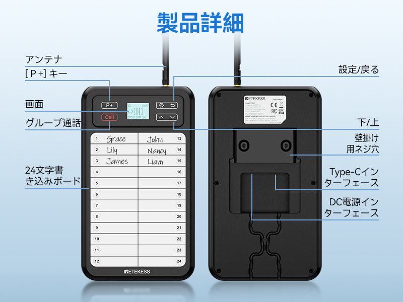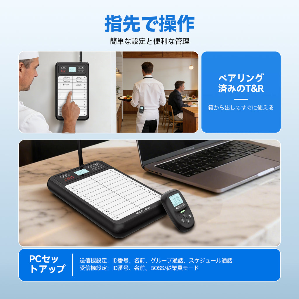 送信機には24文字まで表示できるネームプレート付き。スタッフの名前や具体的な場所・用件などを表示しておけば、「誰に、どこでの用件か」が正確に伝わり、指示ミスを防ぎます。
