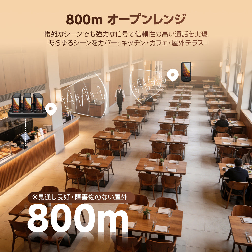長距離利便性:レストラン用ページャーは開放的な屋外空間で800メートルの長距離カバレッジを確保。広大な開放環境でもスタッフが効果的に連絡を取り合えます。