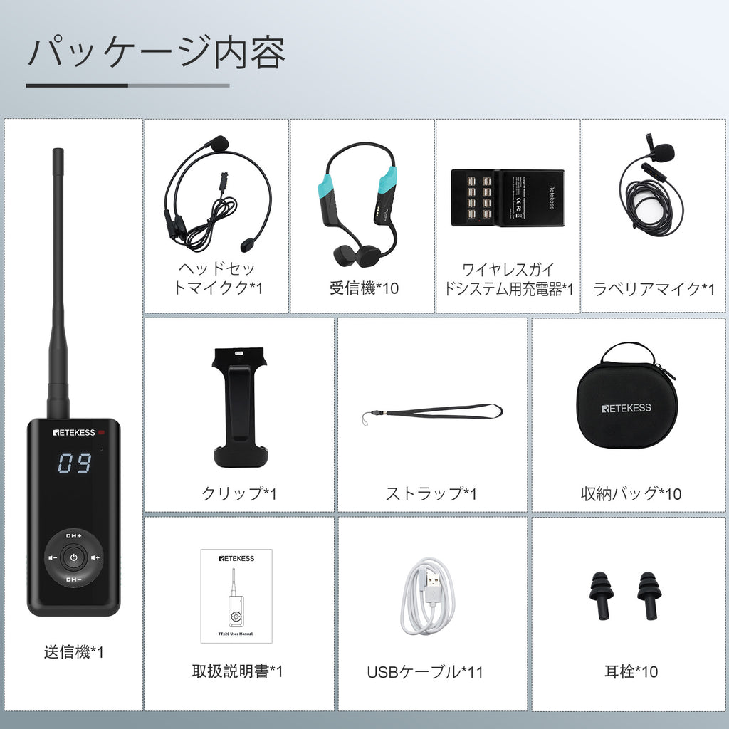 ー送信機は、受信機で録音済みの指導用オーディオやバックグラウンドミュージックを再生するために使用できる外部オーディオデバイスの接続をサポートしています。
