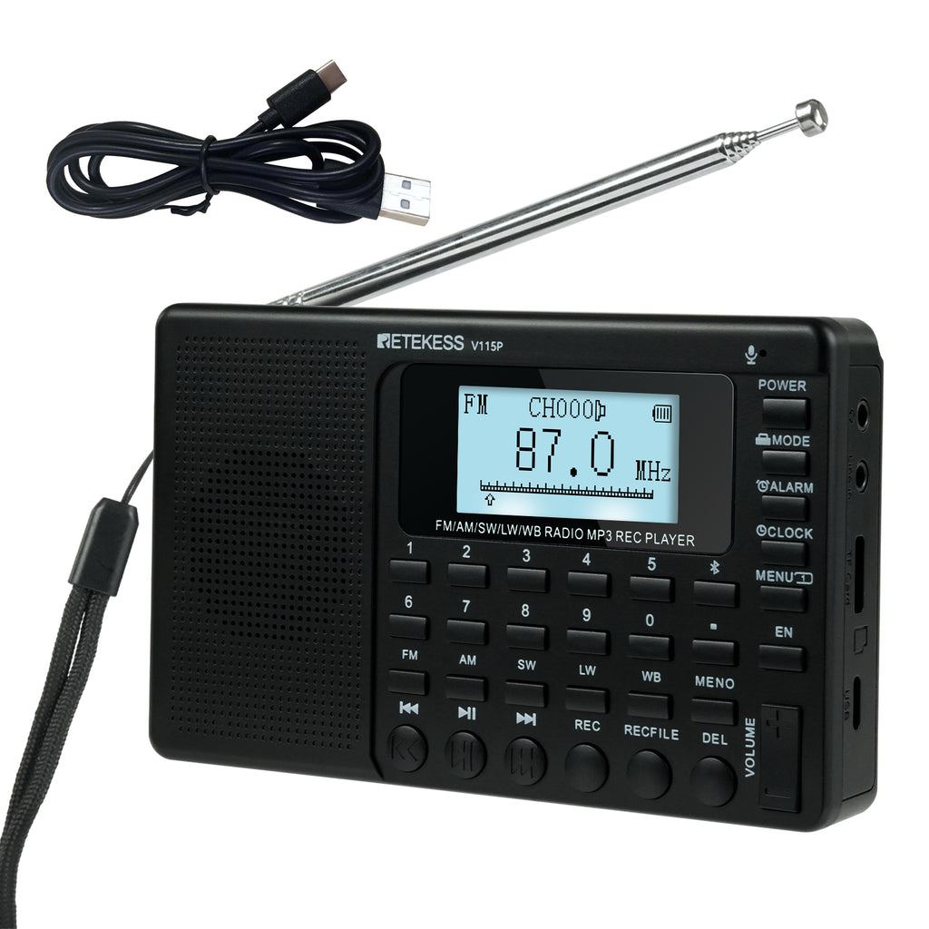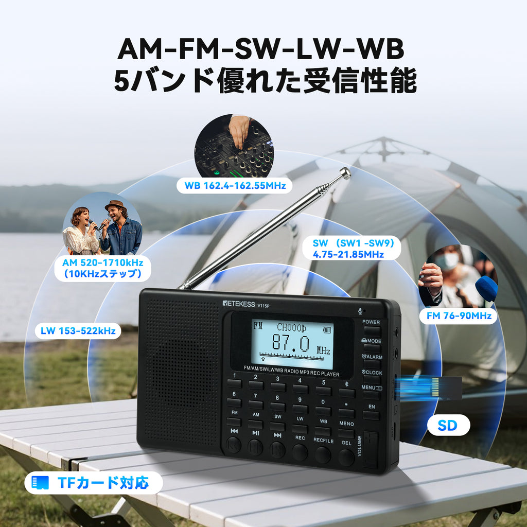 Retekess V115Pオールバンドラジオは、世界中のAM/FM/SW/LW/WBに対応し、ニュースや音楽など、幅広い放送局にアクセスできます。音声録音、TFカードスロット、AUX転送、1800mAhバッテリー、5つのチューニングモードなどの機能を備え、アウトドアや緊急時にも最適です。重低音、USB/TYPE-C接続、明るいLEDライトも魅力です。多言語メニューで、世界中で簡単に使用できます。世界中のユーザー向けに設計されており、あらゆるシーンで活躍する究極のポータブルラジオです。