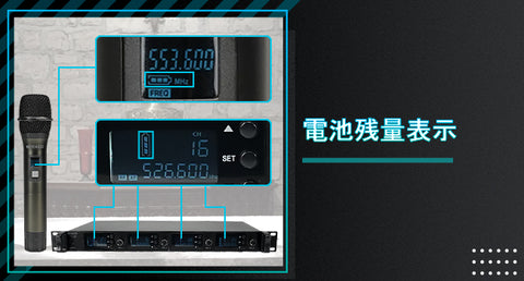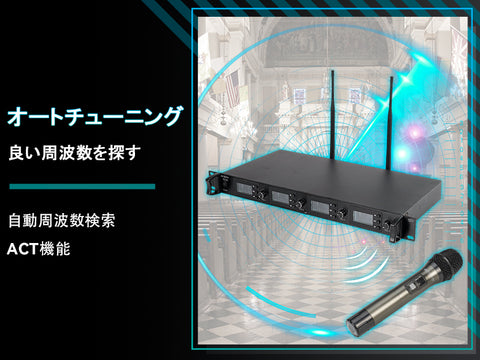 4×50 チャンネルは優れた信号安定性を提供し、歪みを排除します。 4 つのワイヤレス マイクを備えたプロ仕様の受信機には、周波数番号を示す LCD ディスプレイが付いています。