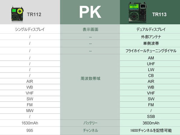 TR112ラジオとTR113ラジオの比較:TR113はTR112のアップグレードモデルです。 全帯域受信可能、外部アンテナ接続可能、デュアルディスプレイ搭載、1600局メモリー可能より大きなバッテリー容量(3600mAh) により、高感度、性能拔群のラジオです。