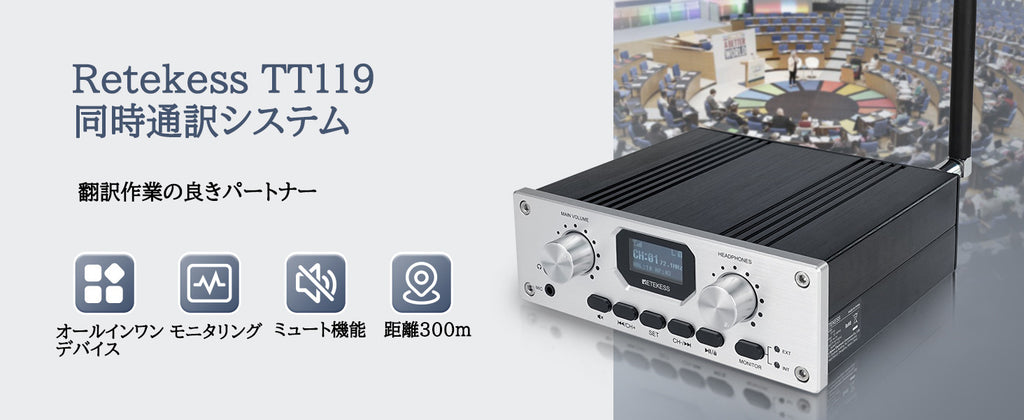 TT119は、言語翻訳に特化したFMマルチチャンネルトランスミッターで、オリジナル音声、翻訳対象のBGM、翻訳音声信号をワイヤレスで送信できます。会議や教会の翻訳、学校教育、観光などで広く使われている同時通訳システム。